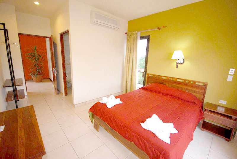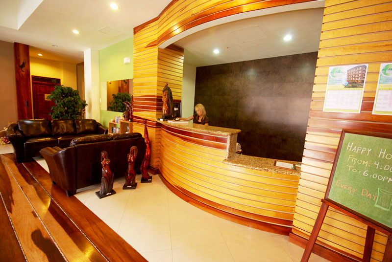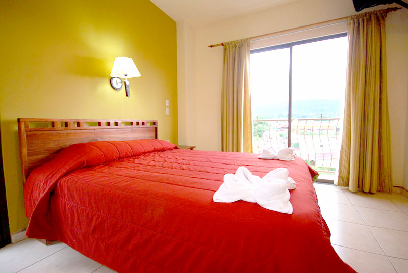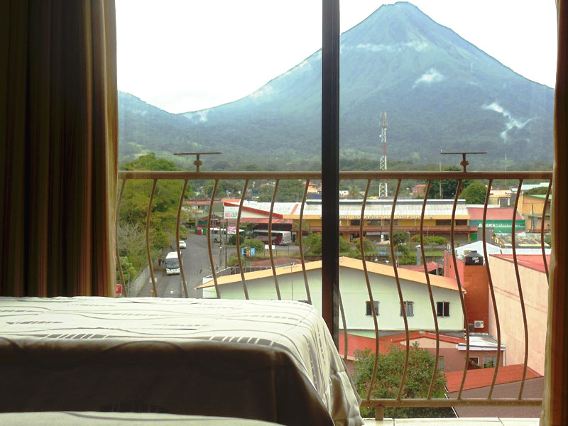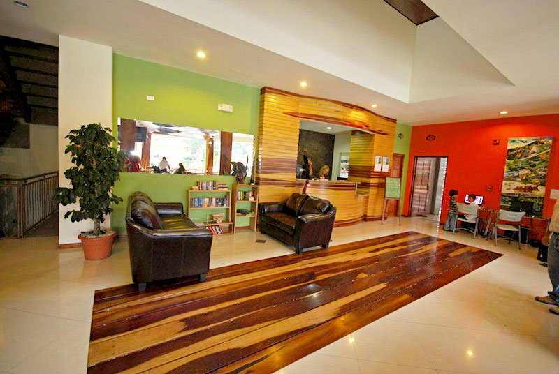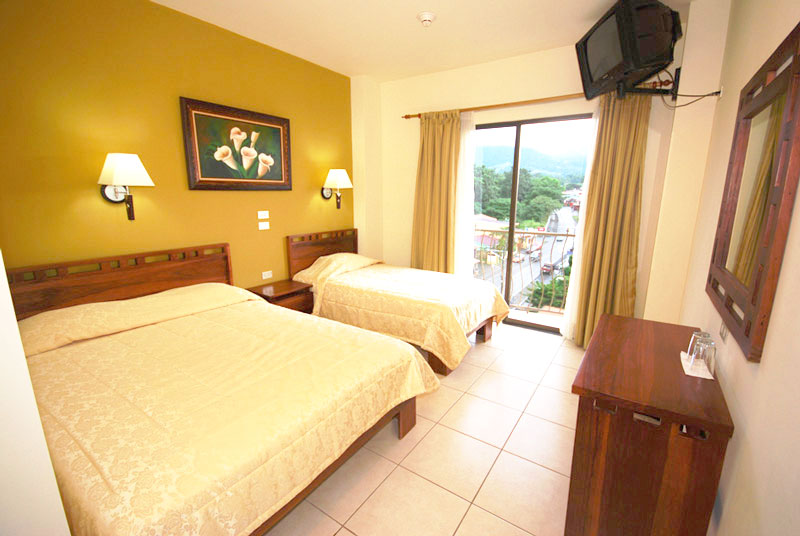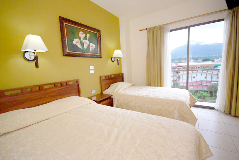 For the enjoyment of our guests, the hotel is located in the center of La Fortuna near to the Arenal Volcano, just a couple of blocks away from the park you will find everything you need to have a perfect holiday, we have a souvenir shops, pharmacies, supermarkets, bus station , taxis, restaurants, bars, laundry, a clinic and gym. Besides this, the hotel has a unique design with a central open area (skylight) that extends to five floors with interior balconies overlooking the lobby, creating a sense of openness and fresh air. Our lobby offers 2 computers with internet connection, a good selection of books in English for exchange and a tour desk with the best prices. Additionally for our guests we offer for free WiFi in public areas and rooms, night security guard, cleaning service , reception from 6 am to 10 pm and free parking for our clients.